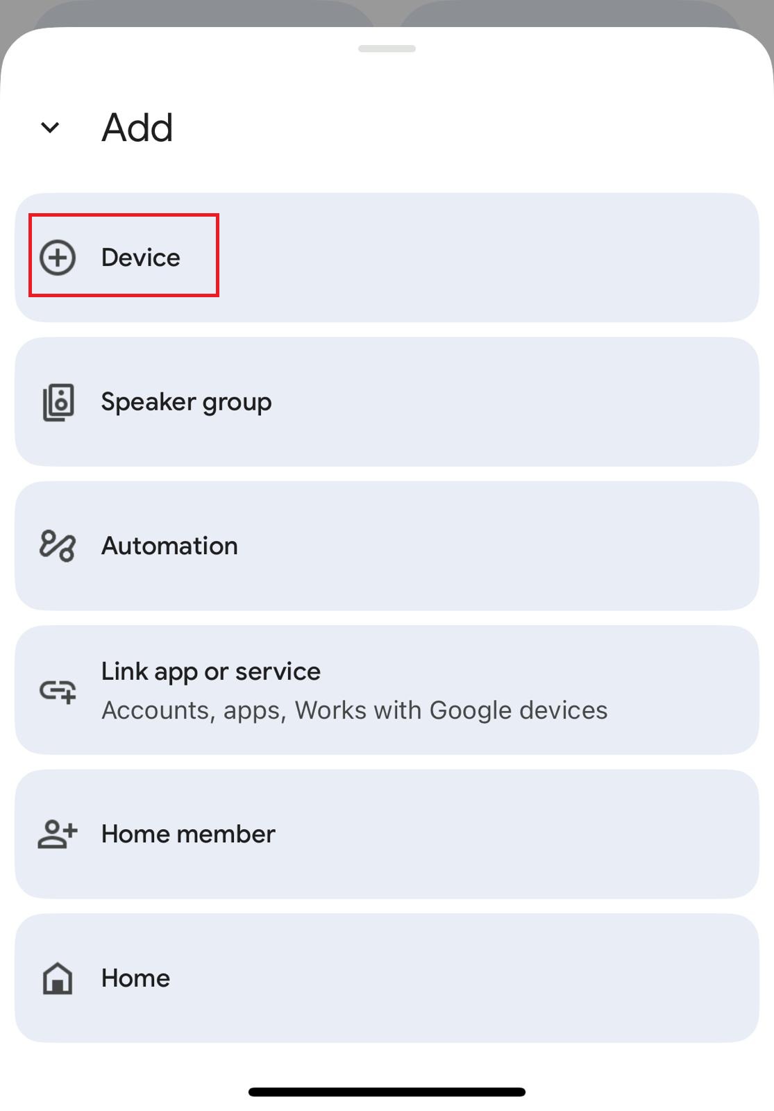 Then choose ‘Device’ to add the new Google Home Mini device. The app will guide you.