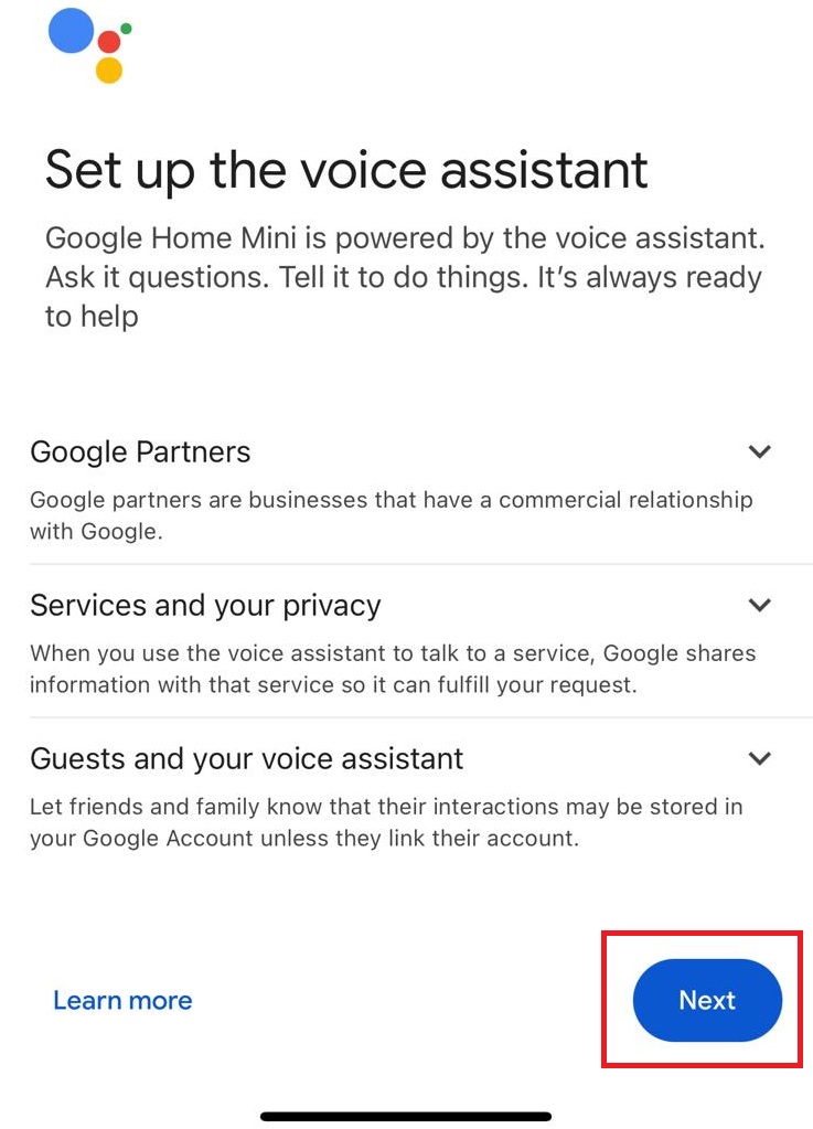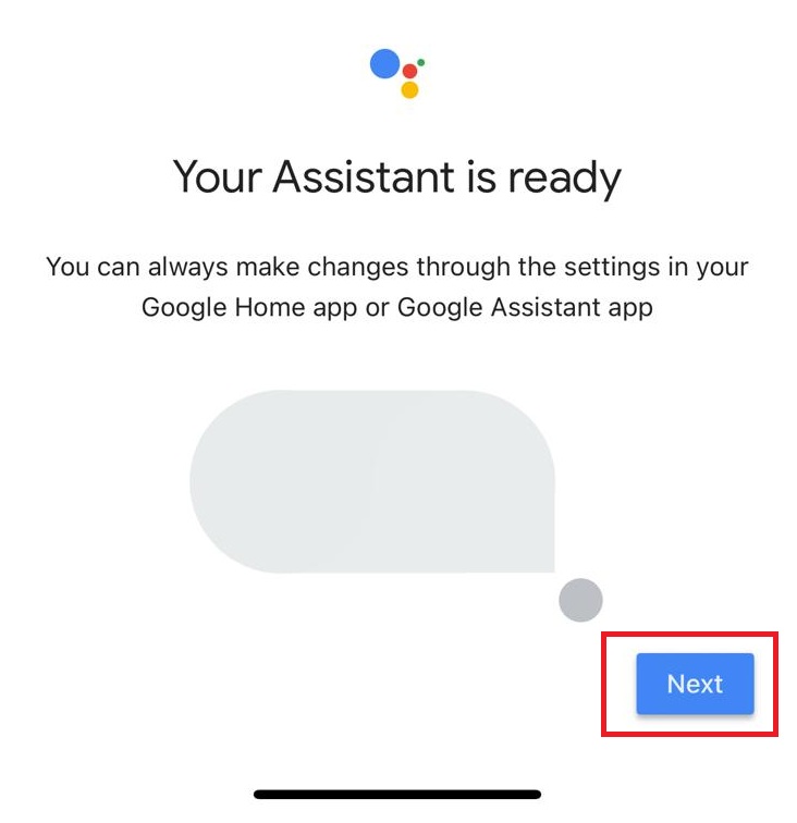 After your Google Home Mini device is connected to your home WiFi successfully, you will proceed to configure the Voice Assistant. Click the ‘Next’ button.
