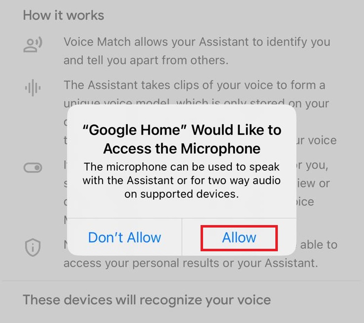 Click ‘Allow’ to let ‘Google Home’ gain access to the microphone, which can be used to speak with the Voice Assistant or for two way audio on supported devices.