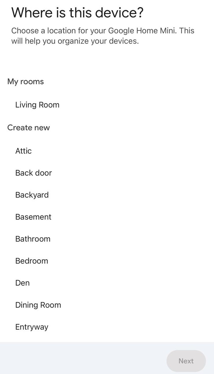 Choose a location for your Google Home Mini device. Later, you can add different devices and categorize them under each location, which will help your organize your devices in a neat way.