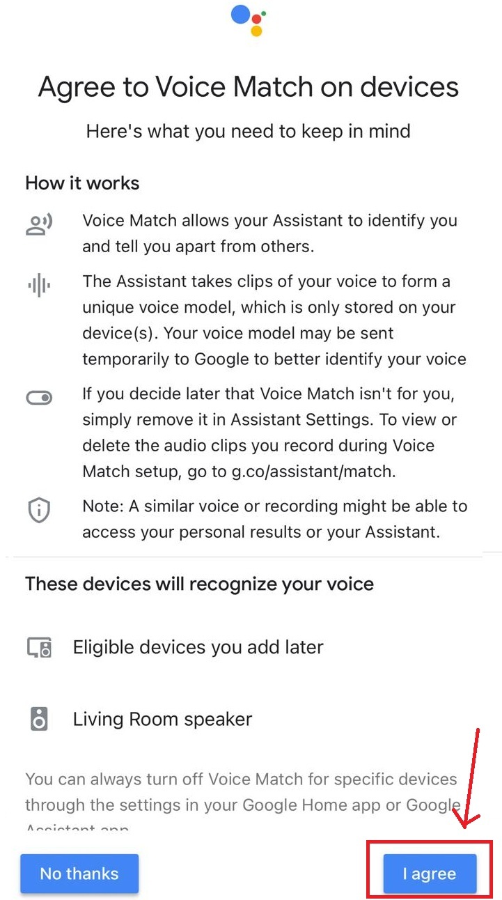 Click ‘I agree’ button to use Voice Match function on devices.