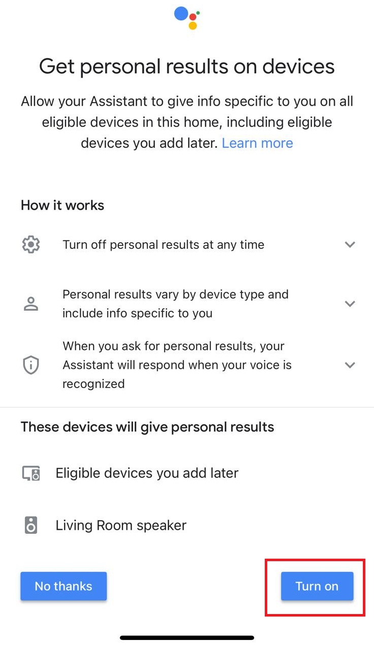 You can turn on the personalized experience if you wish to do so. It allows Voice Assistant to give information specific to you on all connected devices in your home, including eligible devices you add later.